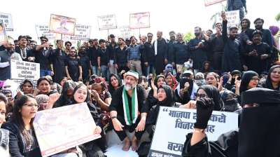 सेना का अपमान करने वाले मंत्री को बर्खास्त करने की मॉग को लेकर काले कपड़े पहन कर गॉधी प्रतिमा के समक्ष धरने पर बैठे विधायक आरिफ मसूद