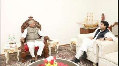 केंद्रीय मंत्री ज्योतिरादित्य सिंधिया ने राज्यपाल राजभवन पहुंचकर राज्यपाल मंगू भाई पटेल से मुलाकात की