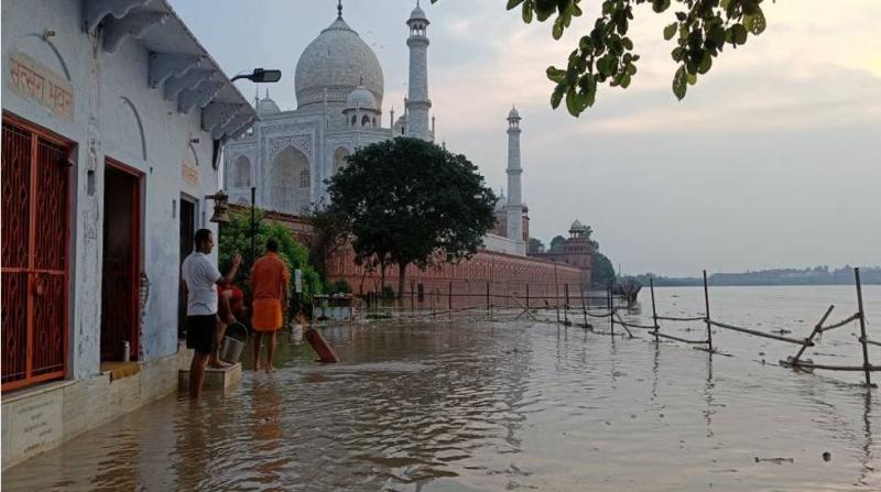 आगरा: यमुना में लगातार जलस्तर बढ़ने से बाढ़ के हालात और विकराल हो गए हैं। यमुना किनारे बसे गांव, कॉलोनियों और बस्तियों में कई फुट तक पानी भर गया है। हालात ये है कि ताजमहल के पश्चिमी गेट तक बाढ़ का पानी पहुंच गया है। इधर ताजमहल के पीछे बने महताब बाग का गार्डन पानी से लबालब हो गया है। स्थानीय लोगों का कहना है कि यमुना में बाढ़ के इन हालातों ने साल 1978 की यादें ताजा कर दी हैं। तब सड़कों पर इतना पानी था कि प्रशासन ने स्टीमर चलवाए थे। सोमवार को यमुना का जलस्तर 152.605 मीटर तक पहुंच गया। जो कि खतरे के निशान से 1.600 मीटर ऊपर है। ताजमहल पश्चिमी एंट्री गेट और दीवारों तक बाढ़ का पानी पहुंच गया है। जबकि महताब बाग में टिकट विंडो सीढिय़ों पर पानी बह रहा है। पानी तेज धार लोगों को डरा रही है। यमुना किनारे बना एडीए का ताज व्यू प्वाइंट के ऊपर से यमुना की धारा बह रही है। इन हालातों को देखकर स्थानीय लोगों में दहशत फैल गई है। लगाातर यमुना में बढ़ते जलस्तर ने लाखों लोगों को हैरत में डाल दिया है।