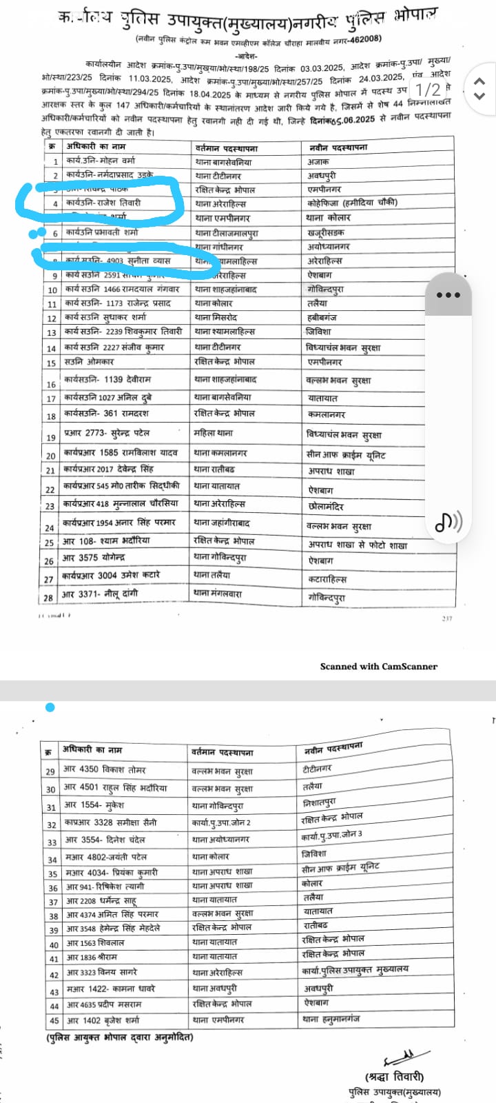 थाना अरेरा हिल्स से हमीदिया चौकी, थाना कोई फिजा में मार्च में आदेश जारी हुआ था, लेकिन अभी तक वे अरेरा हिल्स थाने में ही जमे हुए हैं।