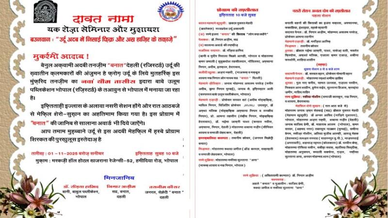 बाब-उल-इल्म पब्लिकेशन्स, भोपाल (रजि.) और अंतरराष्ट्रीय निसाई अदीबी तंजीम ‘बनात’ दिल्ली (रजि.) के संयुक्त तत्वावधान में एक दिवसीय राष्ट्रीय सेमिनार और मुशायरा “उर्दू अदब में निसाई फिक्र और अस्र-ए-हाज़िर के तकाज़े” शीर्षक سے 1 नवंबर 2025 को होटल खजराना रीजेंसी, 52 हमीदिया रोड, भोपाल (म.प्र.) में सुबह 10 बजे से शाम 5 बजे तक आयोजित किया जाएगा, जबकि रात 8 बजे से इसी हॉल में ऑल इंडिया मुशायरा होगा, जिसमें ‘बनाती बहनों’ के साथ भोपाल के आमंत्रित शायर भी शिरकत करेंगे।