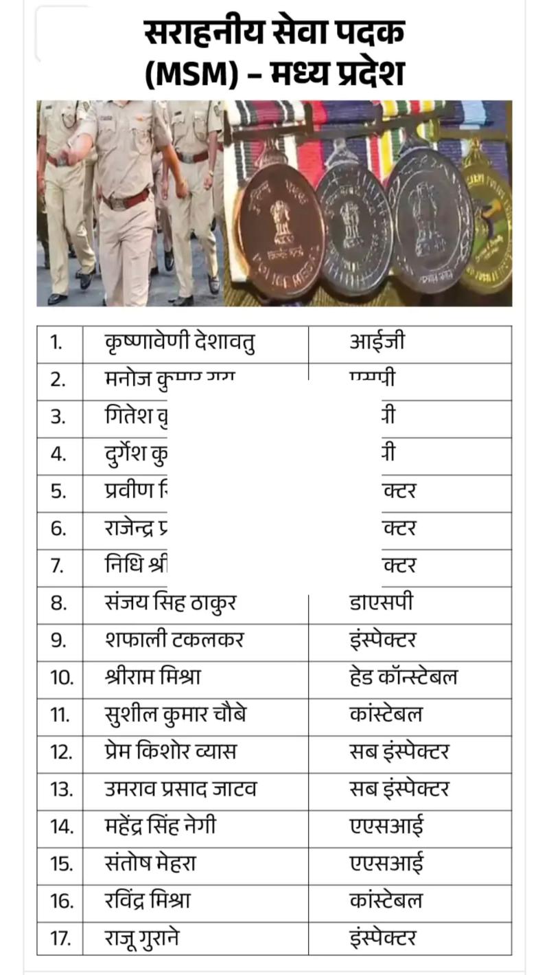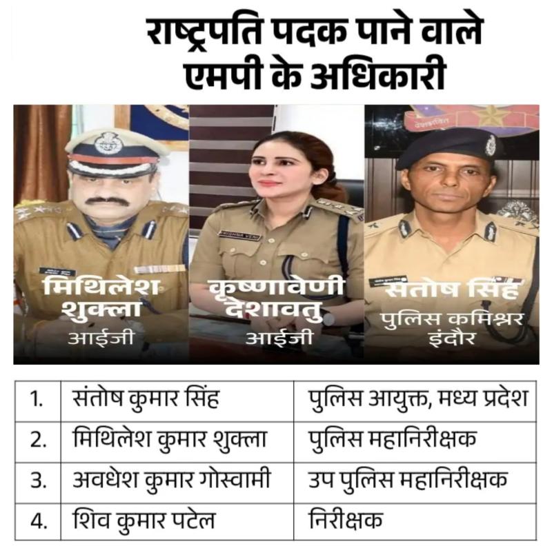जारी आधिकारिक सूची के अनुसार, मध्य प्रदेश के 4 वरिष्ठ पुलिस अधिकारियों को 'प्रेसिडेंट्स मेडल फॉर डिस्टिंग्विशड सर्विस' (राष्ट्रपति पदक) के लिए चुना गया है। इसमें इंदौर के पुलिस कमिश्नर सहित अन्य शीर्ष अधिकारी शामिल हैं, जिन्हें उनकी दीर्घकालिक और विशिष्ट सेवा के आधार पर इस सर्वोच्च सम्मान से सम्मानित किया जा रहा है।