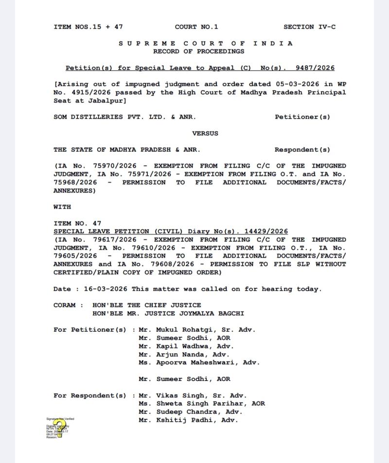 सुप्रीम कोर्ट ने सोम डिस्टिलरीज को नहीं दी तत्काल राहत, मामला फिर हाई कोर्ट के पाले में, 18 मार्च तक जवाब दाखिल करने का निर्देश, 20 मार्च को हाई कोर्ट करेगा अंतरिम राहत पर फैसला