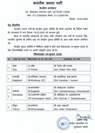 By-election 2026: बीजेपी ने गुरुवार को चार राज्यों की पांच विधानसभा सीटों पर होने वाले उपचुनाव को लेकर अपने प्रत्याशियों का ऐलान किया है। पार्टी ने गोवा की पोंडा विधानसभा सीट से रितेश नवी नायक, नागालैंड की कोरिडांग सीट से दोओचियर आई इम्चेन, कर्नाटक की बागलकोट से बीरभद्रय्या चरंतीमठ, दावगेरे दक्षिण से श्रीनिवास टी. दासकरियप्पा और त्रिपुरा की धर्मनगर सीट से जहर चक्रवती को प्रत्याशी घोषित किया है।
