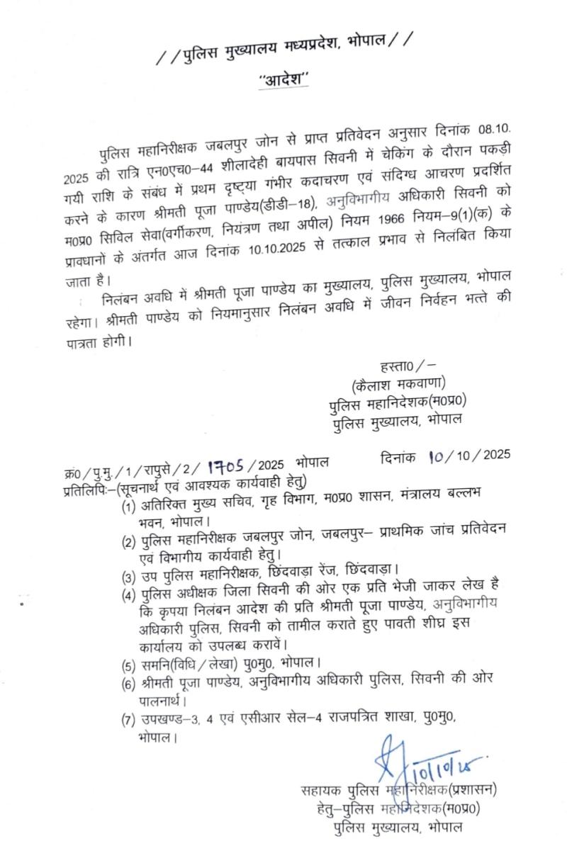 दिनांक 8 अक्टूबर 2025 की रात एनएच-44 शीतलदाही बायपास सिवनी में चेकिंग के दौरान पकड़ी गई राशि के संबंध में श्रीमती पूजा पाण्डेय पर गंभीर कदाचार एवं संदिग्ध आचरण प्रदर्शित करने के आरोप लगे हैं। इस पर कार्रवाई करते हुए पुलिस मुख्यालय ने मध्यप्रदेश सिविल सेवा (वर्गीकरण, नियंत्रण तथा अपील) नियम 1966 के नियम 9(1)(क) के अंतर्गत यह निलंबन आदेश जारी किया है।