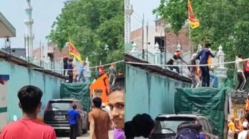 साउथ ईस्ट दिल्ली के तुगलकाबाद इलाके में आज (2 अप्रैल) दोपहर 1.30 बजे के करीब शोभा यात्रा निकालते हुए एक मस्जिद के वजू खाने के टीन शेड पर दो लड़के चढ़ गए और भगवा झंडा लहराया. कुछ ही देर में बाइक पर मौजूद बीट स्टाफ ने उन्हें देखते ही नीचे उतार लिया. इस मामले में पुलिस का कहना है कि एक वीडियो भी सामने आया है, जिसकी जांच की जा रही है. कुछ लड़कों की पहचान भी की गई है. लेकिन अभी कोई आधिकारिक शिकायत नहीं मिली है. आगे जैसी शिकायत आती है, उस हिसाब से कार्रवाई होगी.राष्ट्रीय राजधानी दिल्ली के तुगलकाबाद इलाके में हनुमान जन्मोत्सव के दौरान मस्जिद के पास निकल रही शोभा यात्रा के दौरान हंगामा होने की सूचना मिलने के बाद पुलिस अलर्ट हो गई. आनन-फानन में पुलिस की टीम मौके पर पहुंची और मामले को शांत कराया गया.