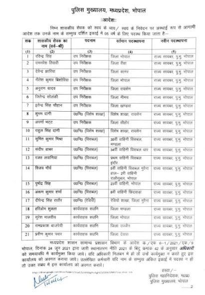 पुलिस मुख्यालय भोपाल से जारी आदेश में 21 पुलिस अधिकारियों के नाम हैं जिसमें 17 उप निरीक्षकों और 4 सहायक उप निरीक्षकों के नाम शामिल हैं जिन्हें विभिन्न इकाइयों से राज्य साइबर सेल पुलिस मुख्यालय में पदस्थ किया है।