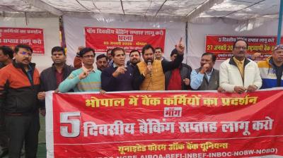 भोपाल की सड़कों पर उतरे बैंक कर्मचारी, सरकार से की पाँच दिवसीय सप्ताह की अपील